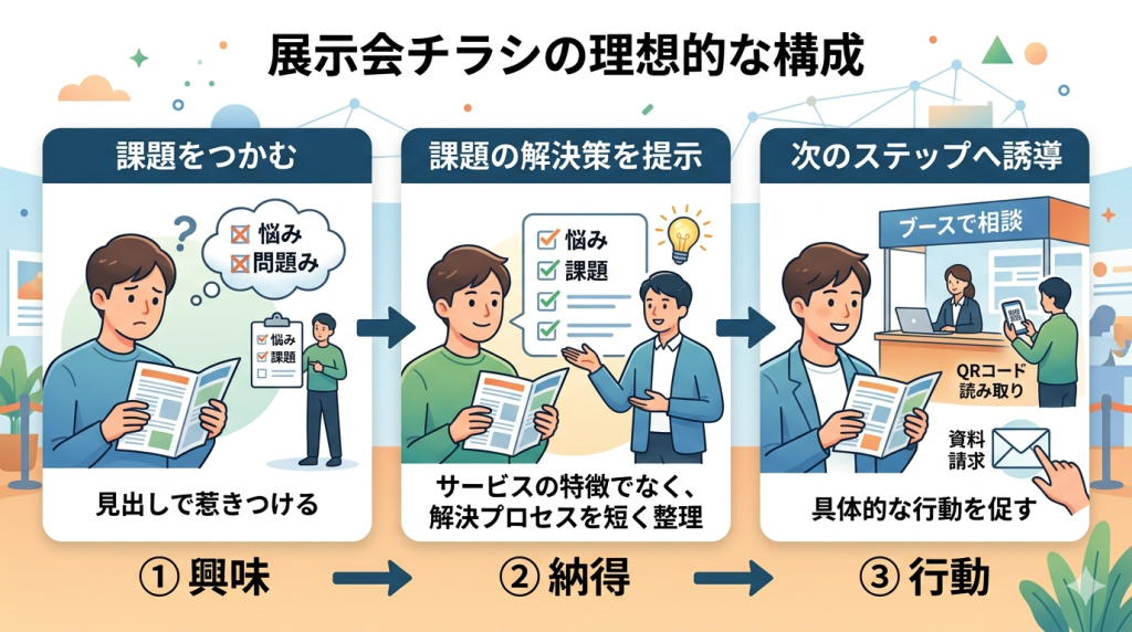 展示会チラシの構成は、読み手の心理に沿って組み立てる必要があります。おすすめはシンプルで、「興味」「納得」「行動」の順です。複雑な設計を持ち込むより、まずこの流れを守るほうが現場では強いはずです。